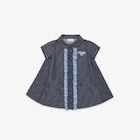 Blue chambray baby dress featuring ruffles with light blue details and all-over FF logo.