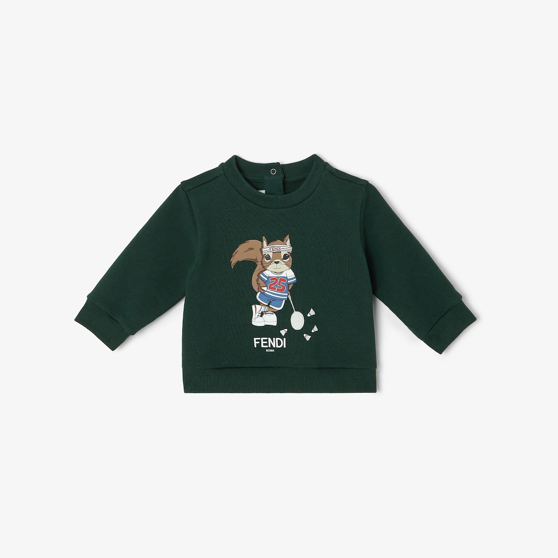 Forest green cotton baby sweatshirt with maxi embroidery and multicolor squirrel print on the front.