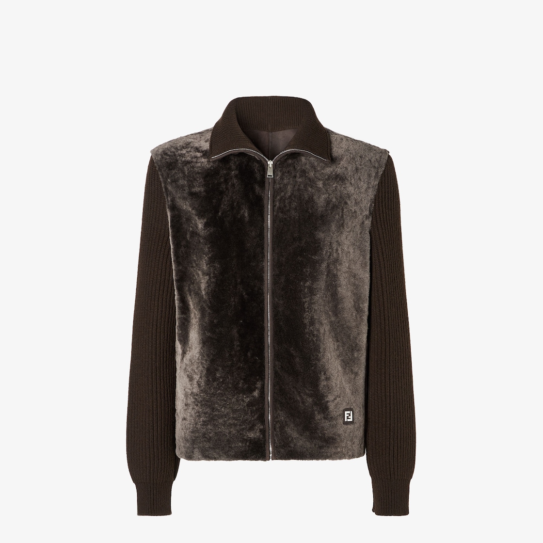 Blouson with high collar and long sleeves. Side pockets. Full-length metal front zip fastening. Made of brown shaved shearling. Wool fisherman’s rib-knit sleeves in the same color. Embellished with a metal micro FF detail on the left-hand side of the hem. Palladium-finish metalware.