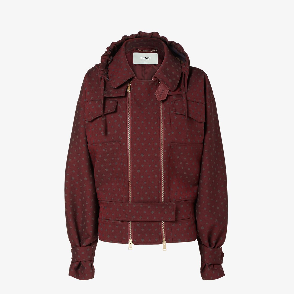 Blouson closed with two parallel full-length metal zippers, featuring a martingale at the front waist. Shirt collar, detachable drawstring hood and low-set sleeves with cuff straps. Patch pockets with button on the chest and side pockets. Made of a burgundy wool blend fabric with an all-over, contrasting color Falena Dots micro motif print. Embellished with a leather undercollar and palladium-finish metalware.