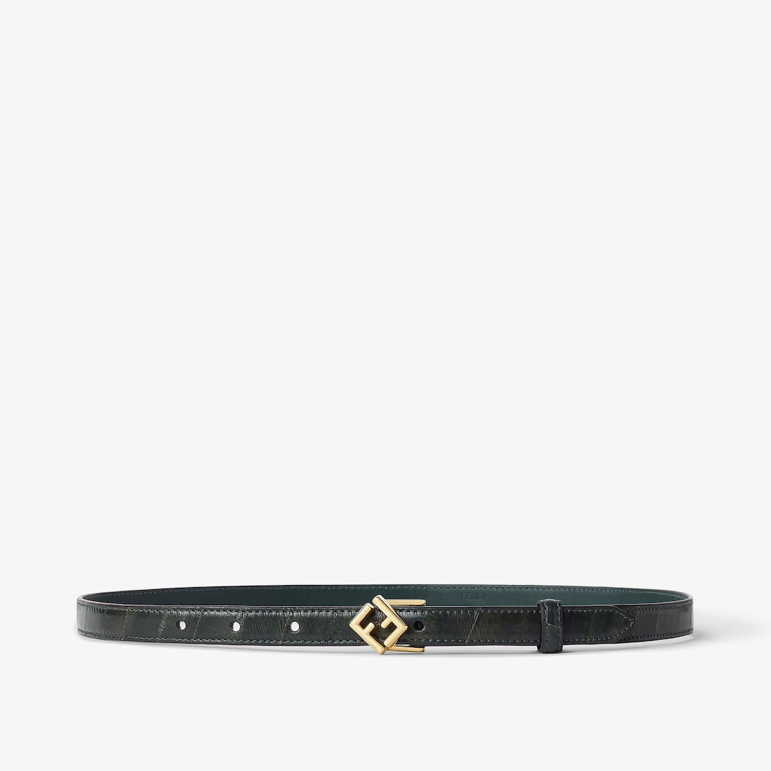 Narrow belt with loop and diagonal FF stud buckle. Made of green hagfish leather with a shiny finish, inlaid diagonally. Gold-finish metalware.