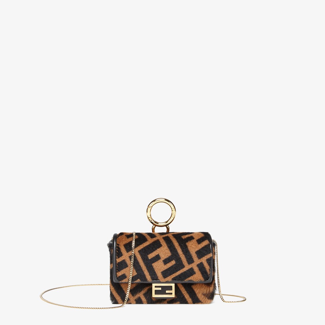 Iconic Baguette bag in Nano version, with flap and FF fastening with magnetic clasp. The clip allows it to be attached to larger bags or belts. It can also be worn cross-body thanks to the thin chain shoulder strap. Lining with flat pocket. Made of shaved sheepskin with the FF print in brown and tobacco. Edges finished with black leather trim. Gold-finish metalware.