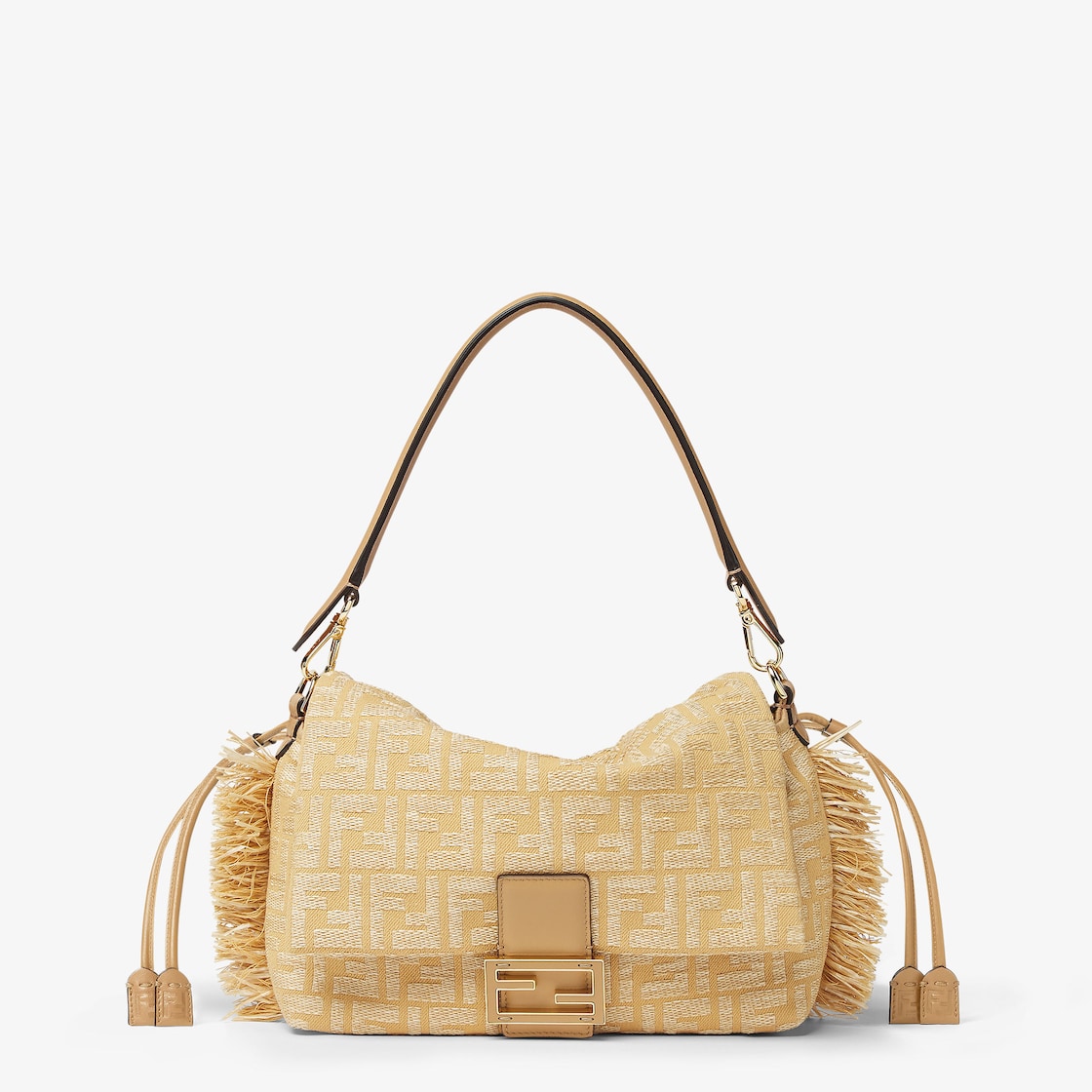 Made of natural-color jacquard fabric with the iconic FF motif in viscose raffia. Decorated with fringes along the edges. FF clasp with beige leather insert.