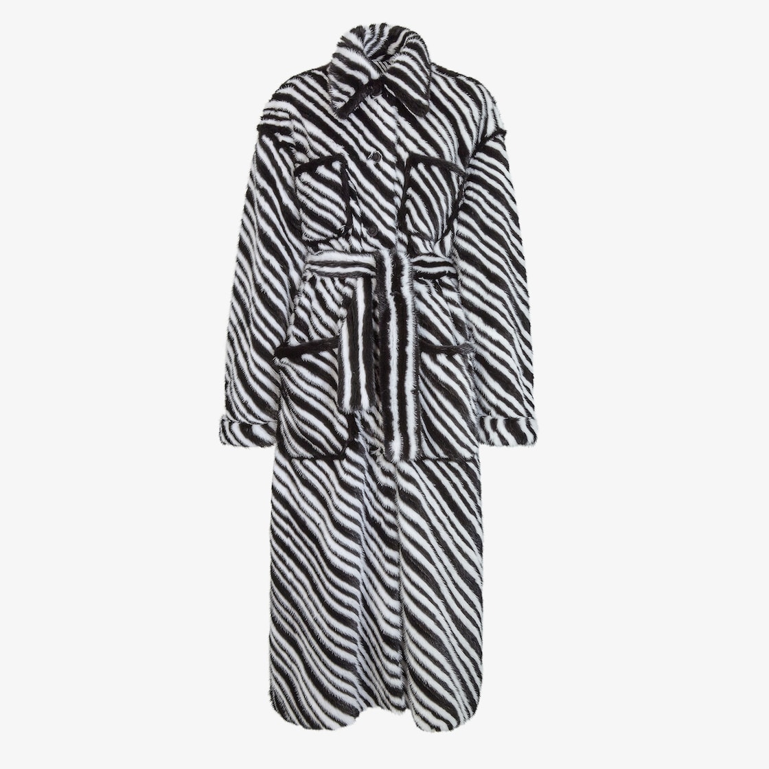Robe-style coat with collar and dropped shoulder. Four patch pockets on the front. Fastened with invisible buttons and matching belt. Lined in printed satin. Made of mink on a chiffon base with striped motif in black and white. The special Featherlike technique makes the garment extremely light to wear.