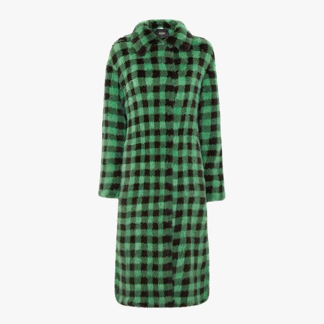 Long, straight-cut coat with lapel. Single-breasted closure with small invisible hooks. Made of mink with check pattern in shades of green and brown. A special tricot mesh knit gives this garment its featherweight quality. Brown suede belt.