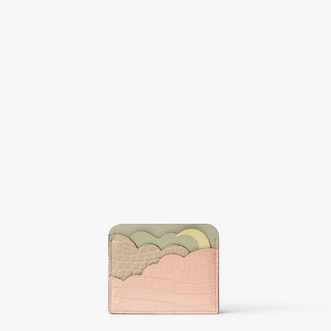 Fendi Postcard card holder with central compartment and six card slots. Made with a multicolored inlay of luxurious crocodile leather and calfskin. The card slots have a contoured edge, playfully shaped to create a sunset between the clouds.
