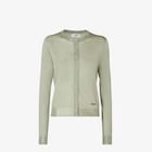 Slim-fit cardigan with round neckline and long sleeves. Ribbed hems and button closure. Made of light pink, extra-fine shiny viscose yarn. Fendi logo embroidered at the hem in a contrasting color.
