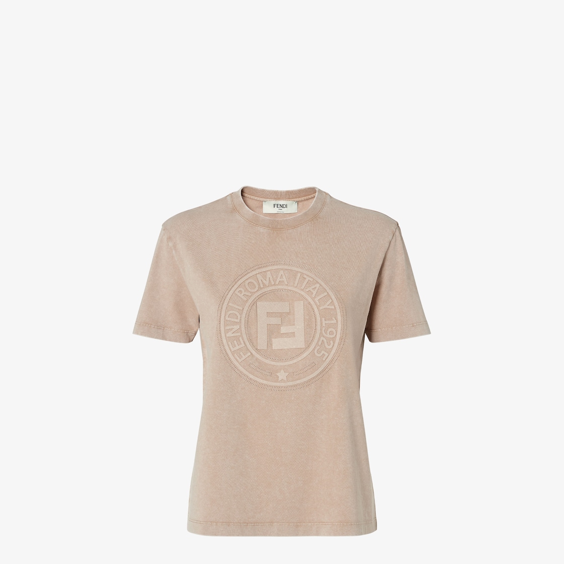 Regular-fit T-shirt with crew neck and short sleeves. Made of light brown washed-effect cotton jersey. Customized with an embossed Fendi Stamp 1925 motif on the front.