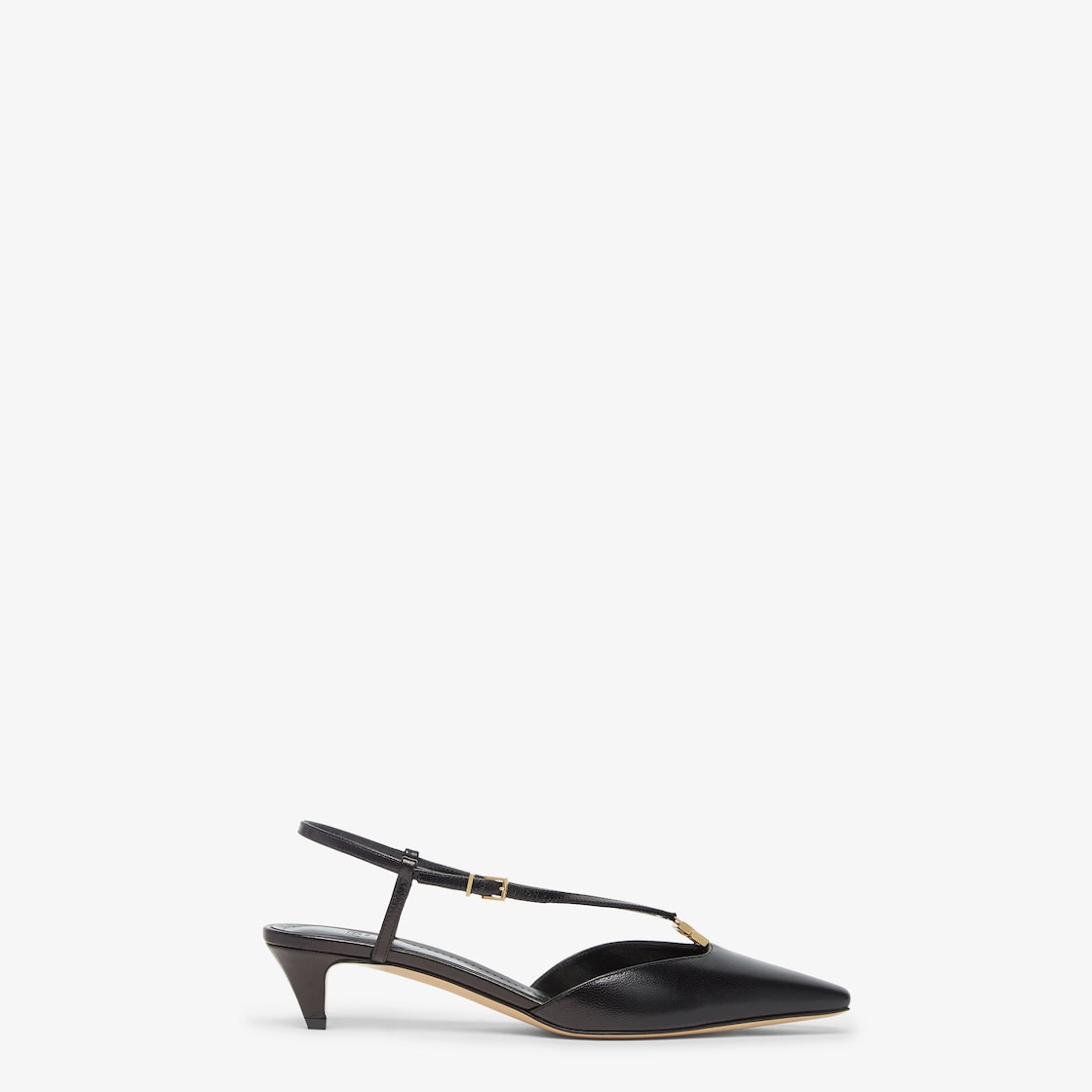 Slingbacks with square toe and straps that wrap around the foot. Embellished with a metal FF detail and featuring a special design that includes a functional hinge in the centre. Made of black leather. Tone-on-tone leather covered heel. Gold-finish metalware.