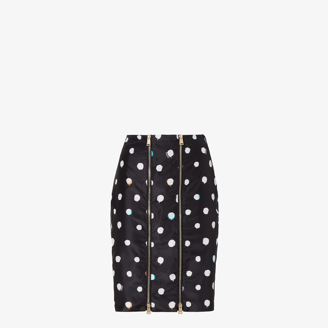 Midi pencil skirt closed by a two parallel metal zippers on the front. Made in a black taffeta printed all-over with a contrasting color Falena Dots motif. Palladium-finish metalware.