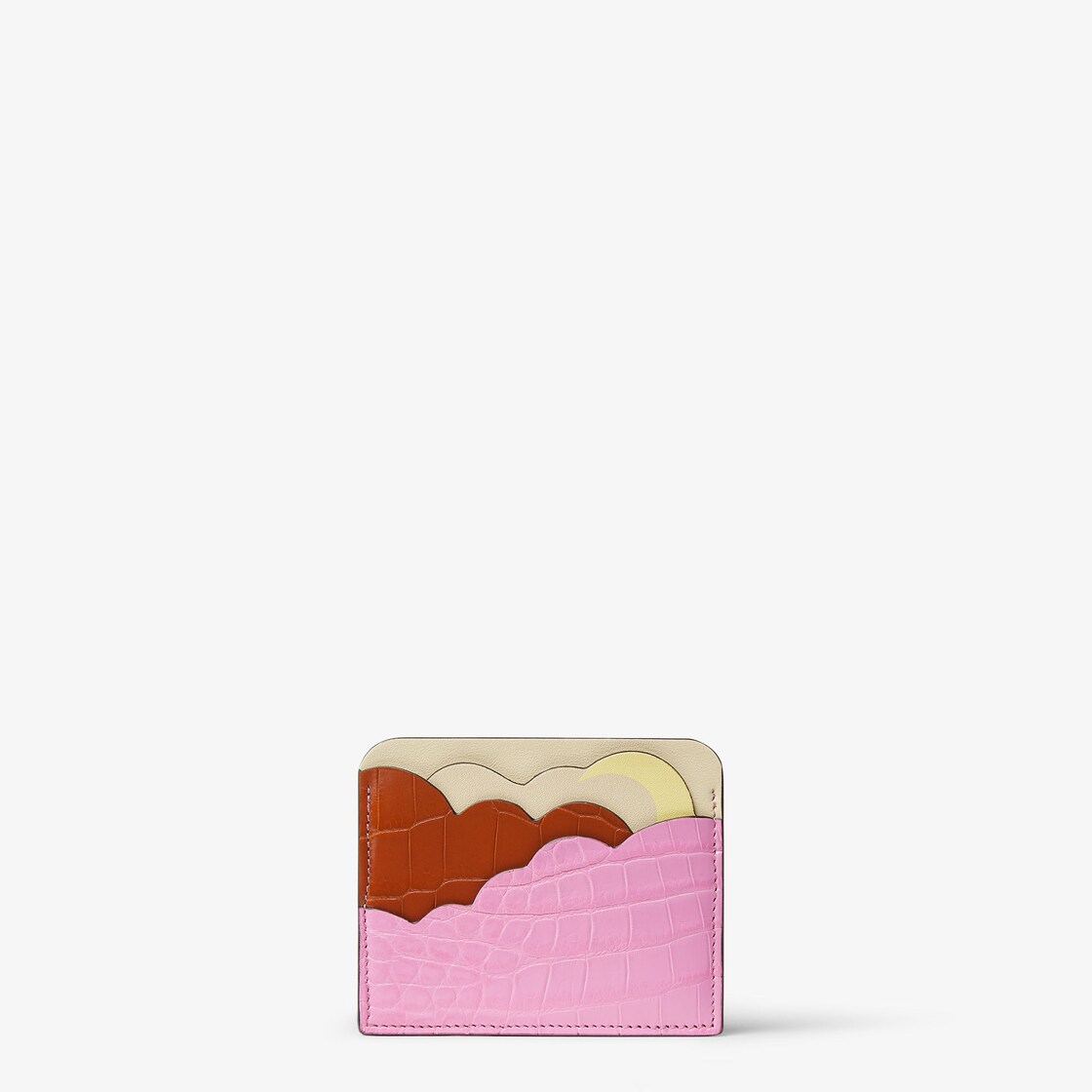 Fendi Postcard card holder with central compartment and six card slots. Made with a multicolored inlay of luxurious crocodile leather and calfskin. The card slots have a contoured edge, playfully shaped to create a sunset between the clouds.